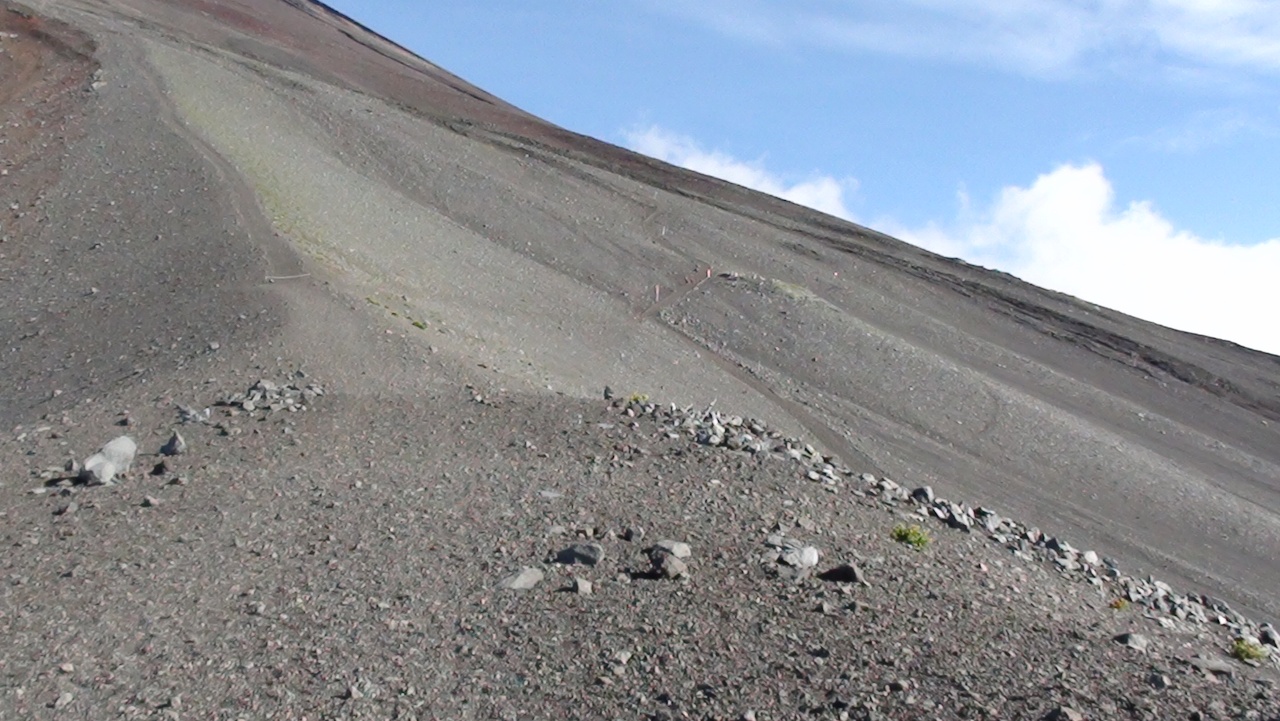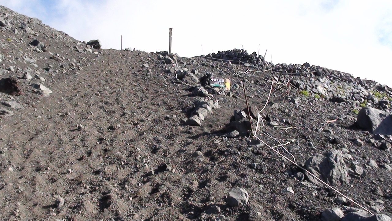 登り始めると、足元は岩がゴロゴロしている。5cmぐらいから、握りこぶし程度の大きさの小石だらけの道を慎重に登っていく。うっかりすると、躓いて捻挫しかねないので、ここは注意が必要だ。さらにしばらく登ると岩が小さくなり、砂利の道になってきた。それと共に道は急な斜面に。足を踏み出すたびザラザラと足が滑り、中々進めない。これが噂に聞く砂走りか?(実際には違う)